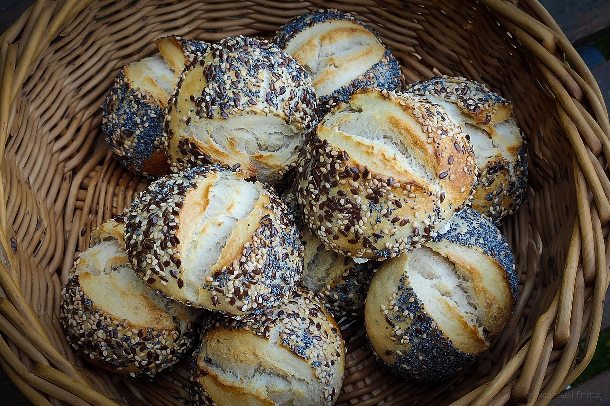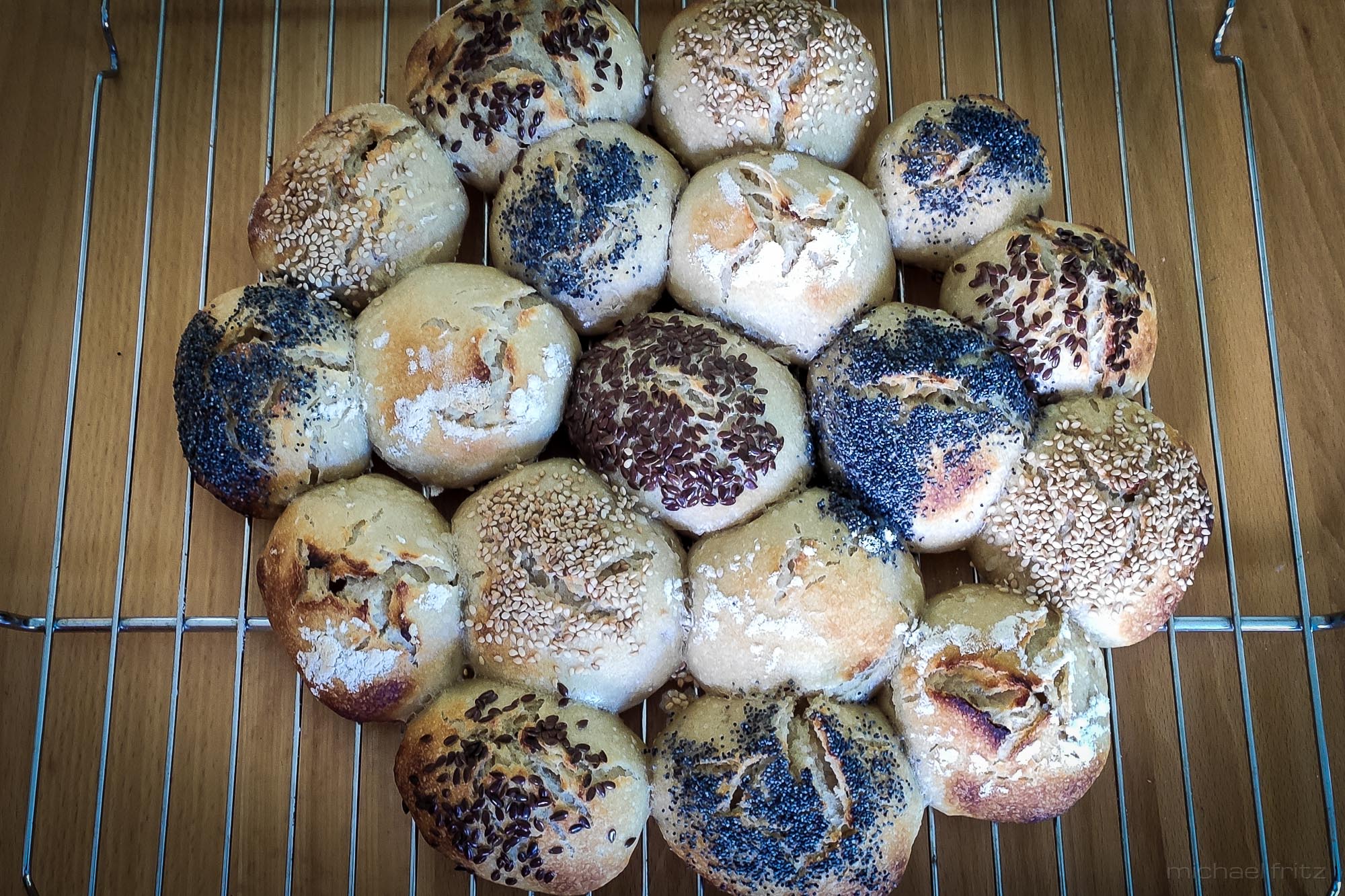 Etwas Mohn, Sesam, Leinsamen und Sonnenblumenkerne in einer Schüssel vermischen. Die Teiglinge in Wasser tunken und beidseitig mit dem Gemisch panieren. Auf ein gemehltes Backblech legen und mit einem Tuch abgedeckt etwa 60 Minuten gehen lassen.