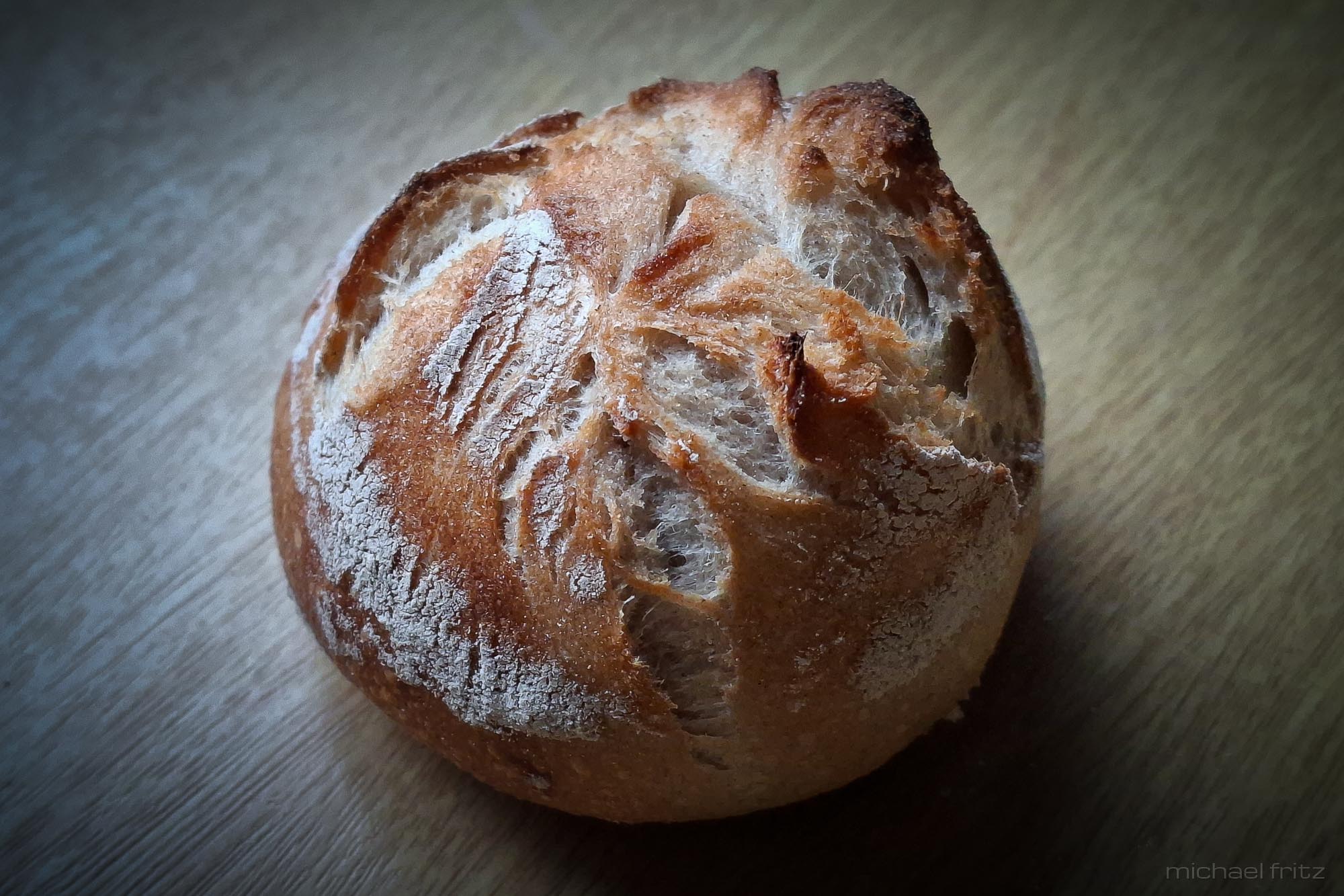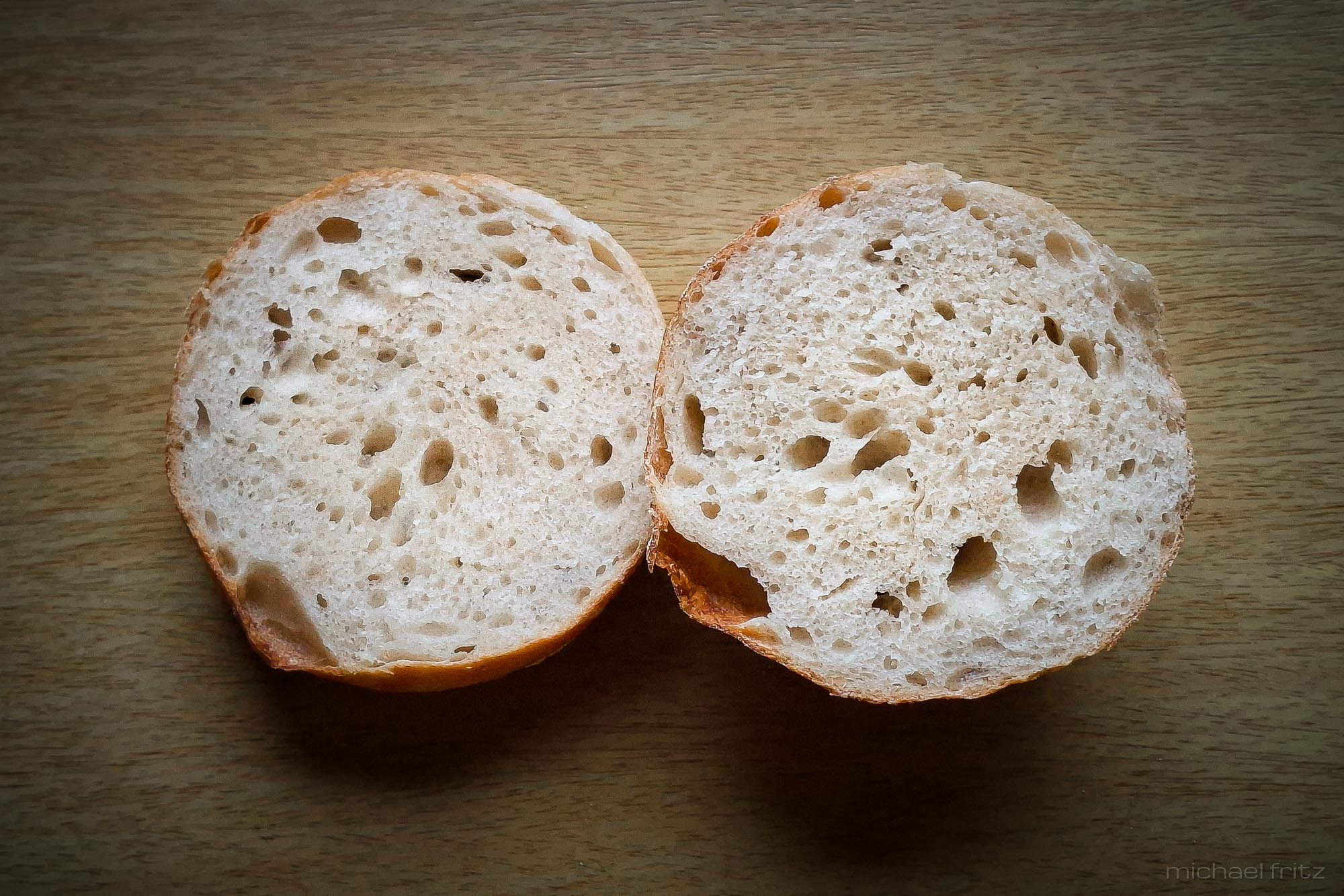 Die Brötchen mit dem Verschluss nach oben auf ein mit Backpapier belegtes Blech legen, in den vorgeheizten Ofen schieben und den Ofen bedampfen. Die Backtemperatur auf 230 Grad reduzieren und die Brötchen 15 - 20 Minuten backen. Nach 10 Minuten den Ofen kurz öffnen, um den Dampf entweichen zu lassen.