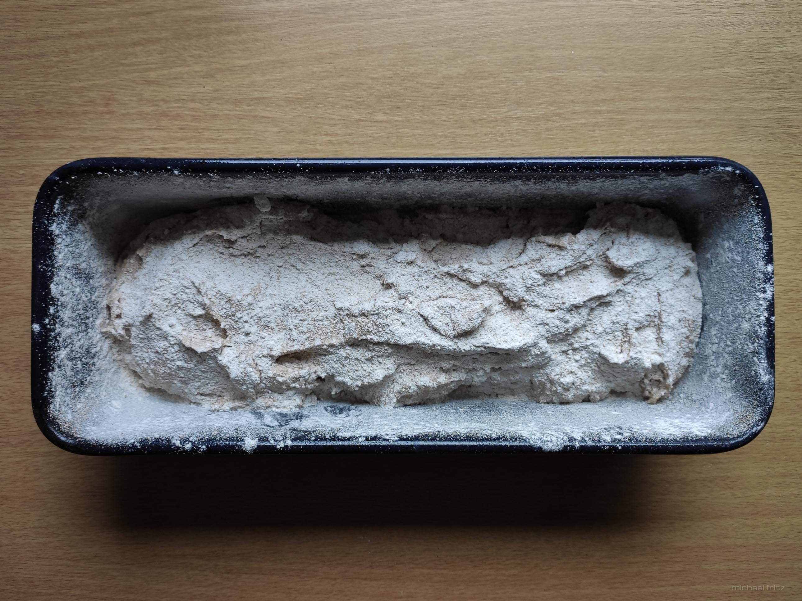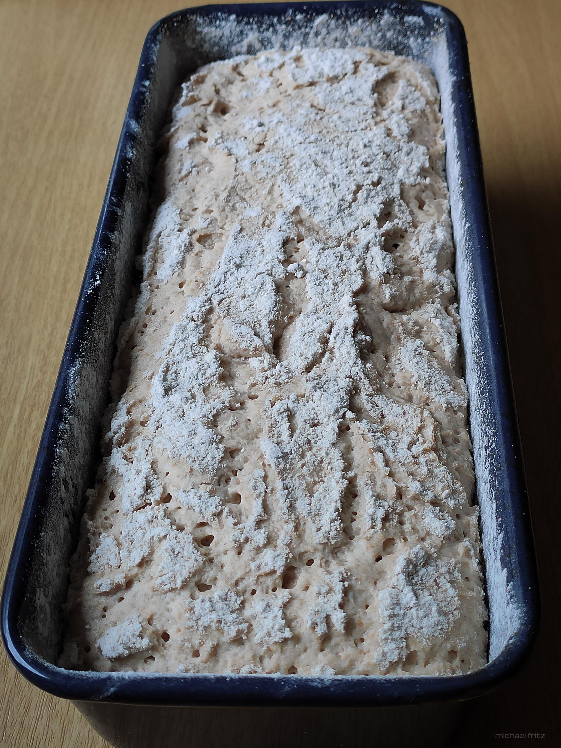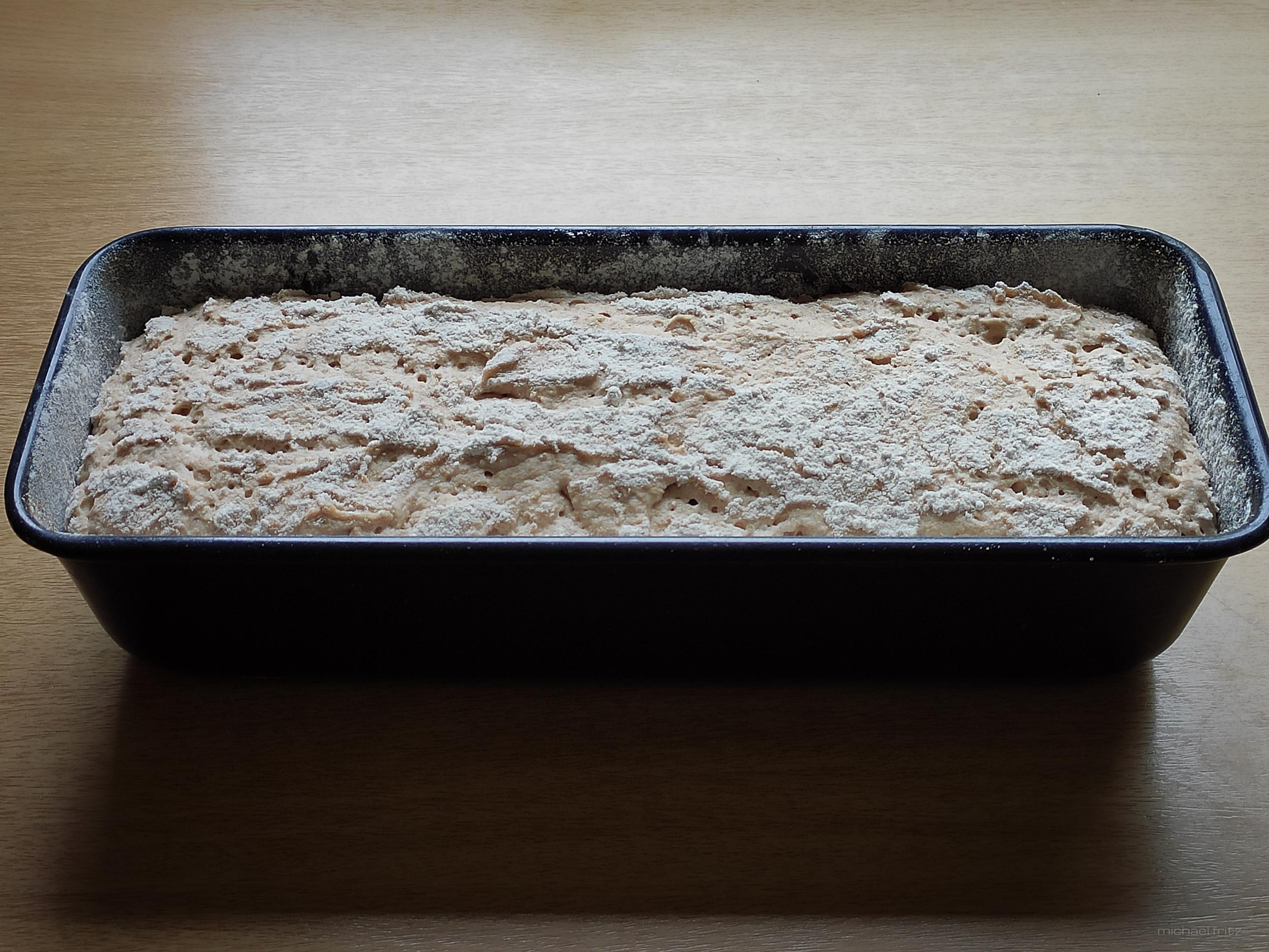 Variante 2: Den fertigen Teig etwas bemehlen und in eine geölte und gemehlte Kastenform (25cm) oder Brotbackschale legen. Den Teig in der Backform noch einmal bemehlen.